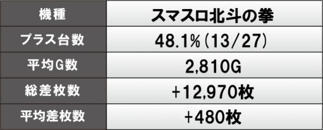 『スマスロ北斗の拳』は設置されている約半数がプラス差枚をマーク。上記でも挙げたように、当日のトップ差枚数を記録した547番台+8,250枚を筆頭にファンは手応えを感じていたに違いない。また、『L南国育ち』では勝率8割とこちらも大活躍。平均差枚1,786枚という大きな熱量で盛り上がっていた。