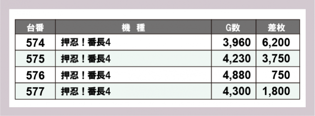 注目の最新台『押忍!番長4』では、4台の横並び好況スポットが形成されていた。574番台+6,200枚を筆頭にピックアップした4台の平均差枚は+3,125枚をマーク。明らかな好感触に遊技するファンは自然と手応えを感じていたはずで、有意義な時間を過ごせたことだろう。
