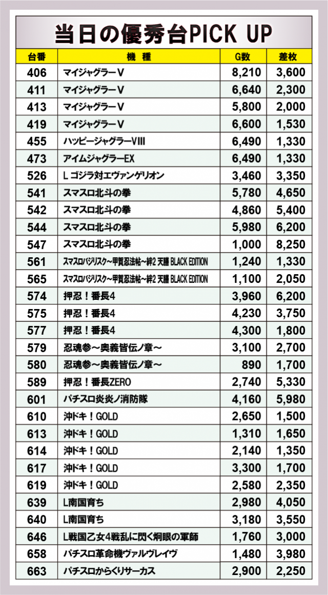 優秀台に目を通してみると、『スマスロ北斗の拳』547番台+8,250枚や『押忍!番長4』574番台+6,200枚、『パチスロ炎炎ノ消防隊』601番台+5,980枚など、各台で大きな熱気が放たれていた。その他、『ジャグラー』シリーズが人気を博していた様子も見逃せないばかりだ。