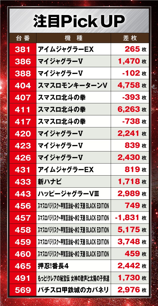 全台系をはじめ、+2,000枚オーバーの好調台が多数誕生していた今回のブラックデビルズ降臨。次回開催時にはこれらを参考に、是非チャンスを掴んでくれ!