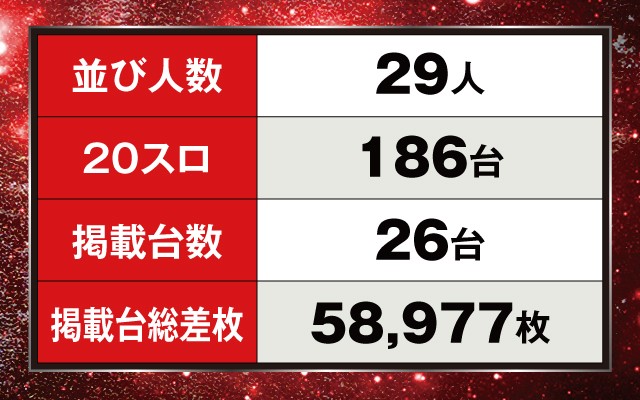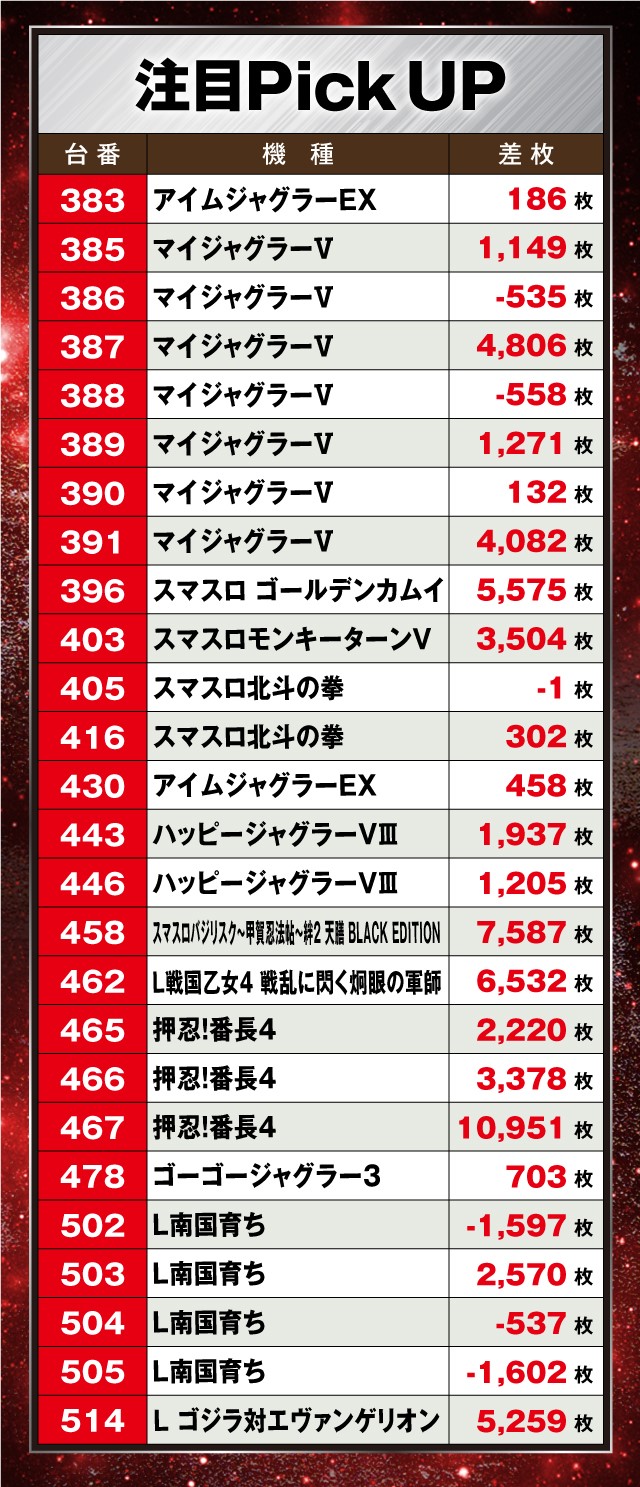 もっとも注目を集めていたのが『押忍!番長4』。3台平均+5,516枚と圧巻で、内1台は万枚オーバーを達成している!また『L南国育ち』も全台系となっていたが、こちらは惜しくもマイナスの台が多かった。