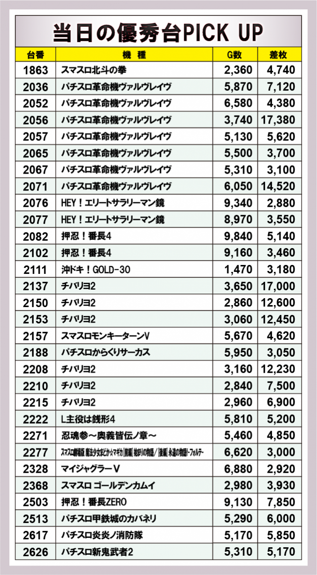 優秀台に目を通してみると、差枚数で大きな数字を打ち立てたのが『チバリヨ2』で4台の万枚OVERを記録!さらに、『パチスロ革命機ヴァルヴレイヴ』でも2台の万枚OVERが存在し、スマスロ勢の熱量の高さを窺うことができる。