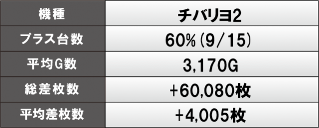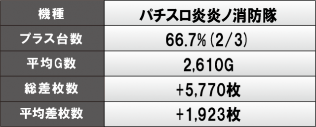 『チバリヨ2』『HEY!エリートサラリーマン鏡』『パチスロ炎炎ノ消防隊』の3機種は、どのAT機よりもポテンシャルが高かったと言える。いずれも勝率6割以上、平均差枚数4桁をマークしており、綺麗な右肩上がりのグラフを描いては、打ち手の自信も深まっていったことだろう。なかでも『チバリヨ2』は、上記でも述べた通り万枚OVERが4台存在し、圧倒的存在感をみせていた。