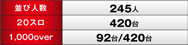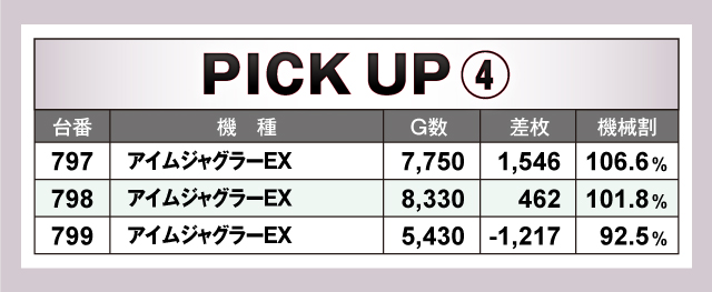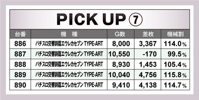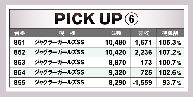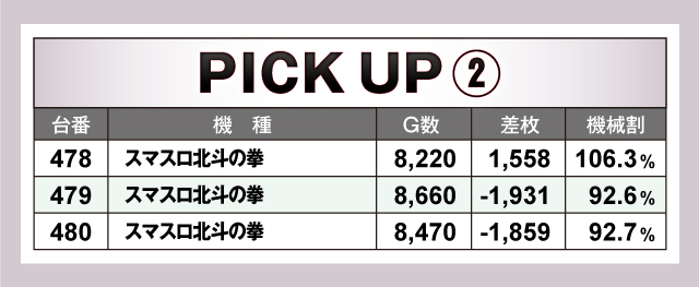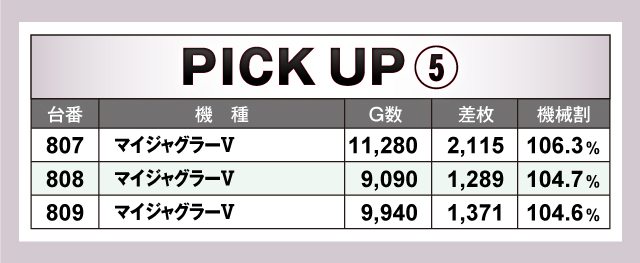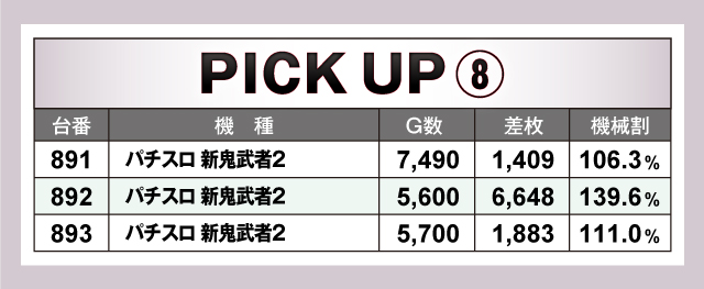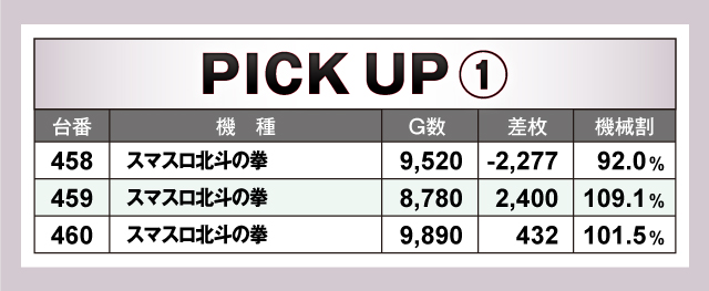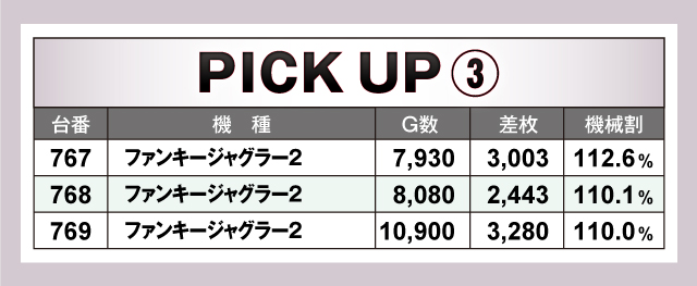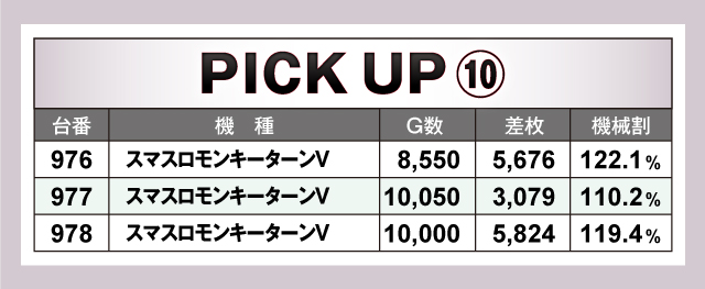 続いては、当日とくに店内を盛り上げた10箇所の並びを紹介していこう。10箇所のうち9箇所の並びがトータルプラス終了で、そのうち5箇所が平均差枚+2,000枚オーバー! それらのなかでもっとも活躍していたのは976番台〜978番台の「スマスロモンキーターンV」の3台並びで、3台全てが+3,000枚オーバーのプラスで、平均差枚は+4,860枚と素晴らしい結果をマーク! もちろんその他並びも優秀だったので、今後は並びに意識して立ち回ってみよう!