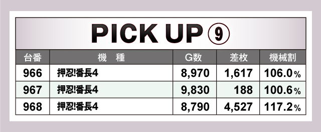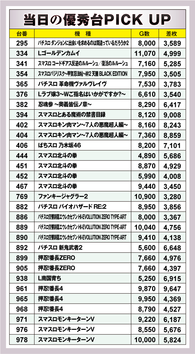 まずは優秀台30台の紹介から。なんと30台すべてが+3,000枚オーバーで、そのうち+5,000枚オーバーは13台出現! それらの中でもっとも優秀だったのは、961番台の「押忍!番長4」で、差枚+9,647枚の大記録をマーク! また店内全体を見てみると、スマスロや6.5号機、ノーマルタイプまで様々な種類の機種から好記録が続出! 多くの人が楽しめる環境が整っていたようだ!
