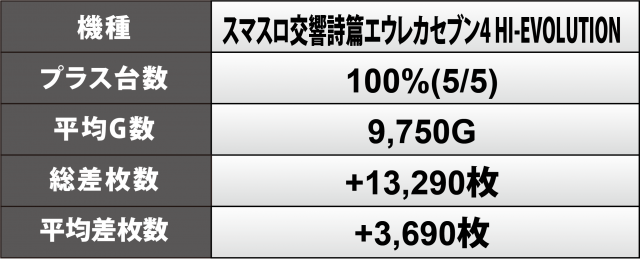 『スマスロ交響詩篇エウレカセブン4 HI-EVOLUTION』では5台全てがプラスを達成し、+4千2百枚超をトップに、その合算は+1万3千枚超、1台あたりの平均は+3千7百枚弱の高水準となった。