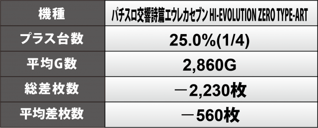 一方、『パチスロ交響詩篇エウレカセブン HI-EVOLUTION ZERO TYPE-ART』では4台中1台のみがプレイヤーの勝利と些か残念な結末となってしまった。平均ゲーム数では+3千に満たず、もっとブン回していれば結果は上向いていたかもしれない。