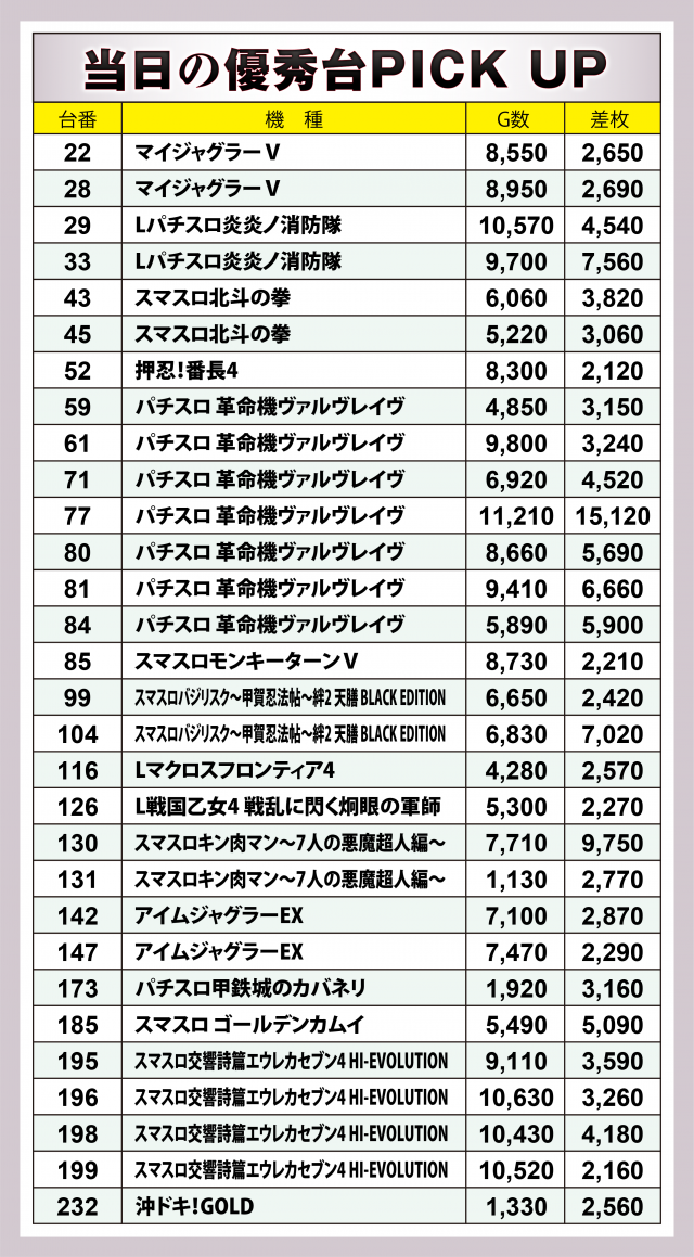 ここからは、当日の出玉データから優秀台の詳細を振り返っていこう。