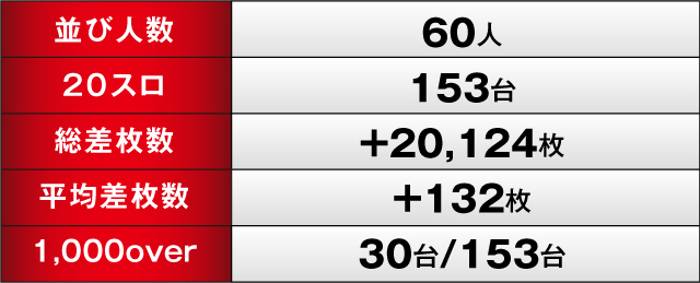 まずは上位30台からチェック。30台のうち全体の6割弱となる17台が+2千枚以上の差枚数を達成し、+3千枚以上は8台、+5千枚オーバーは3台、+6千枚オーバーは2台となった。