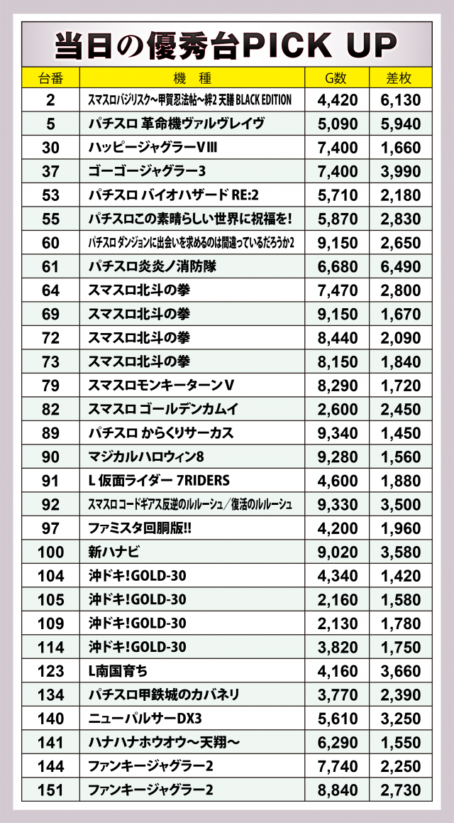 ここからは、入手した当日の出玉データから、優秀台の詳細に迫っていく。