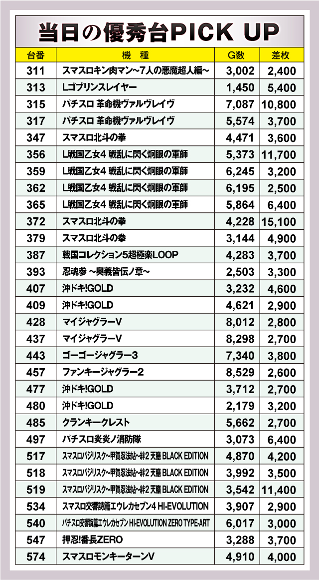 まずは優秀台30台の紹介から。30台すべてが+2,000枚オーバーで、+3,000枚オーバーは21台出現。それらのなかでもっとも優秀な成績を収めたのは372番台の「スマスロ北斗の拳」で、差枚+15,100枚の超結果! またランクイン台を詳しく見てみると、「L戦国乙女4 戦乱に閃く炯眼の軍師」や「スマスロバジリスク~甲賀忍法帖~絆2 天膳 BLACK EDITION」「沖ドキ!GOLD」など、特定の機種から複数台がランクイン! チャンスは特定機種に固まっていた可能性が高そうだ!