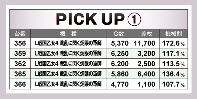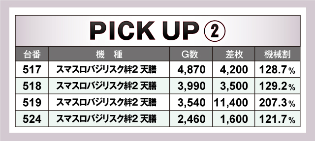 続いては、当日とくに賑わいを見せた2機種を紹介していこう。まず「L戦国乙女4 戦乱に閃く炯眼の軍師」は、356番台の+11,700枚を筆頭に好記録が連発! ピックアップ5台の平均差枚は+4,980枚と素晴らしい結果を残していた! そして「スマスロバジリスク~甲賀忍法帖~絆2 天膳 BLACK EDITION」は、ピックアップ4台すべてが4ケタオーバーで、平均差枚+5,175枚とこちらも好結果をマーク! これら2機種が当日の盛り上がりを牽引していたことは間違いなさそうだ!