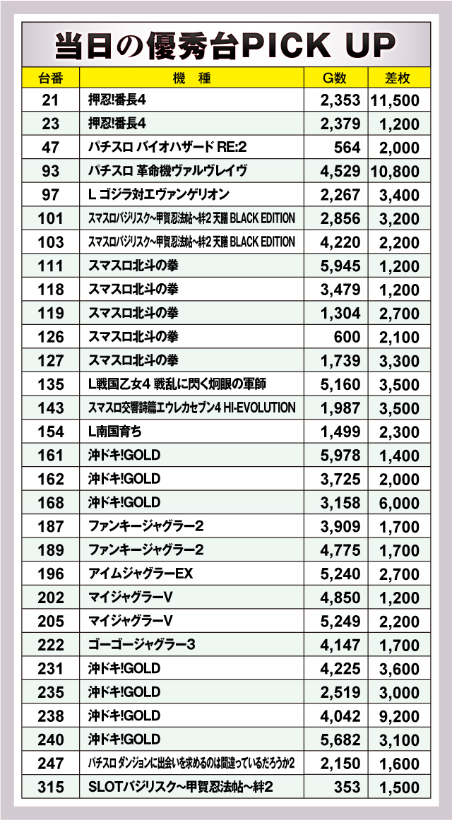 まずは優秀台30台を紹介していこう。30台のうち20台が差枚+2,000枚を超えており、+3,000枚超えは12台出現。しかもそのうちの2台は+10,000枚を超える好記録をマーク! それらのなかでもっとも優秀だったのは、21台番の「押忍!番長4」で、差枚は大台突破の+11,500枚を獲得! またその他機種を見てみると、スマスロを中心に多くの機種から好記録を出現しており、このことからも幅広い機種にチャンスが隠されていた可能性が高そうだ!