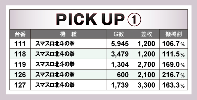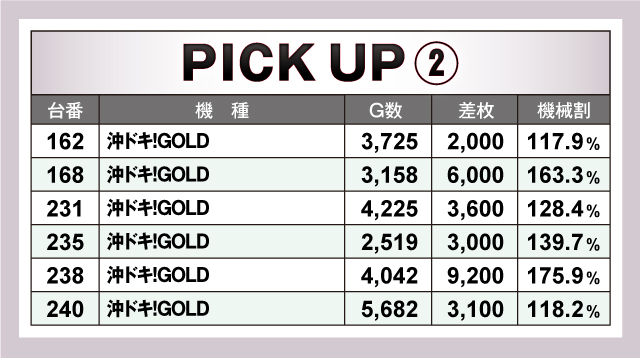 続いては、当日とくに店内を盛り上げた2機種を紹介していこう。まず「スマスロ北斗の拳」は、ピックアップ5台の平均差枚は+2,100枚と上々の結果をマーク! そして「沖ドキ!GOLD」は、ピックアップ6台のうち半数以上が差枚+3,000枚以上と圧倒的で、平均差枚も+4,483枚と当日もっとも活躍していた機種で間違いなさそうだ!