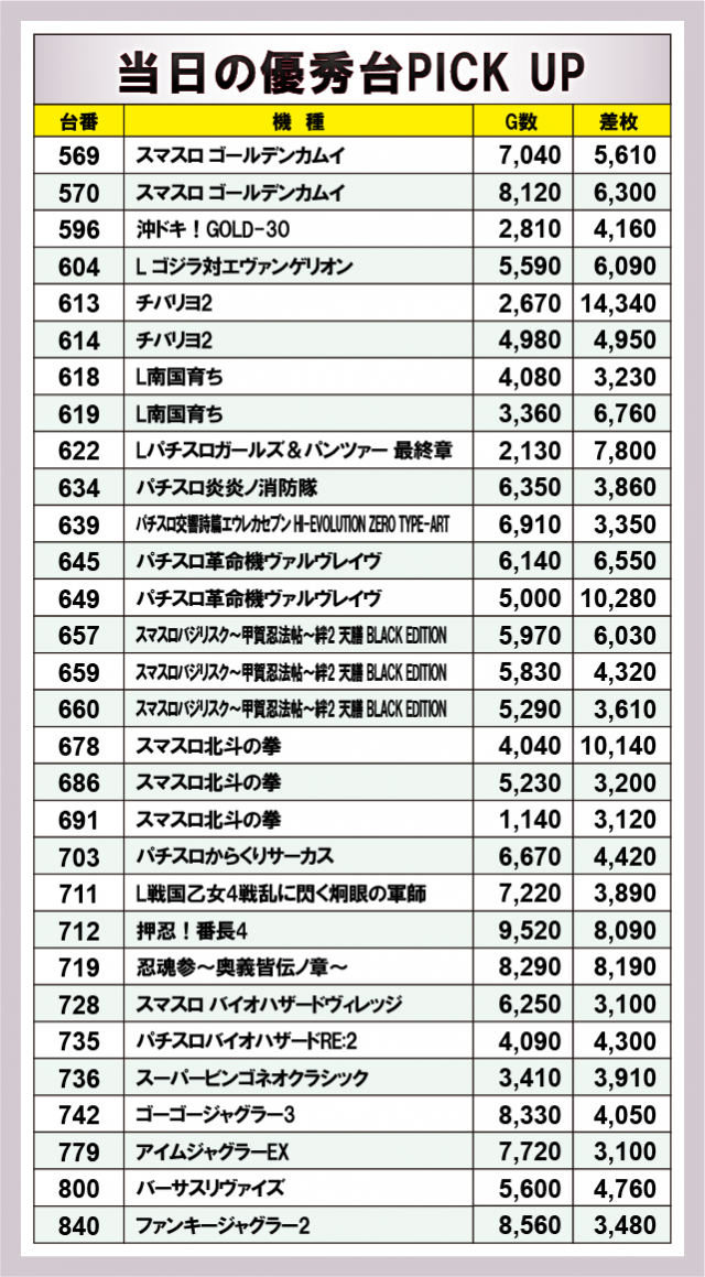 上表をご覧の通り、優秀台に3台の万枚OVERを確認できる。『チバリヨ2』613番台+14,340枚・『パチスロ 革命機ヴァルヴレイヴ』649番台+10,280枚・『スマスロ北斗の拳』678番台+10,140枚と、人気機種から大きな熱が放たれており、店内の盛り上がりは閉店まで最高潮だったと言えるだろう。