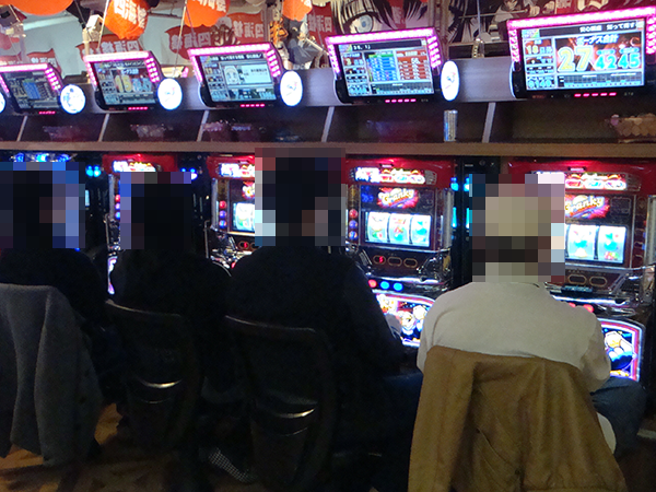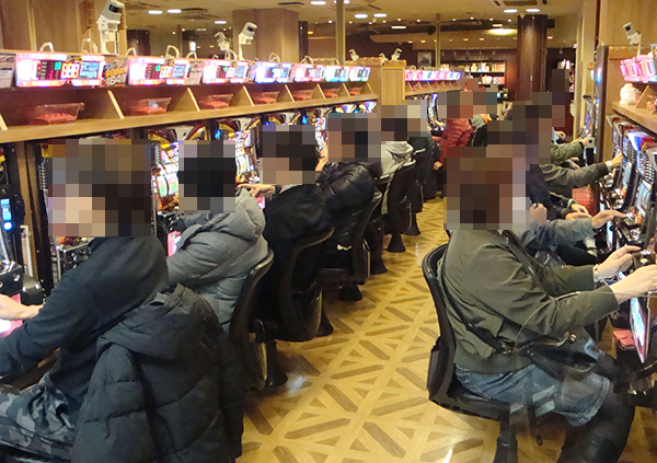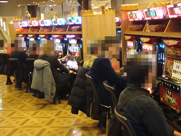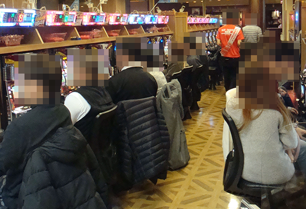 朝イチは20円パチスロのジャグラーシリーズがもっとも人気。「マイジャグラーⅡ」や「マイジャグラーⅢ」などがほぼ満席であった。