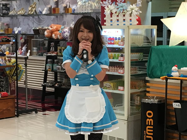 今回はメイド風コスチューム! 頭の黒いリボンがワンポイント♪ マイクで丁寧にご挨拶もできました。
