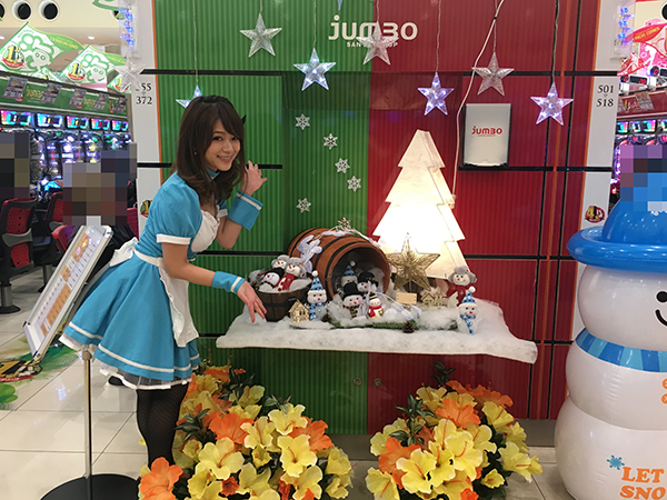 ホール内はすみずみまでとってもきれいに掃除されていて、清潔な感じ! クリスマスの飾りつけもセンスが良くてかわいらしい☆ 果生梨ちゃんも気に入ったみたい。居心地の良い空間で遊技できて、大満足の実戦になりました!