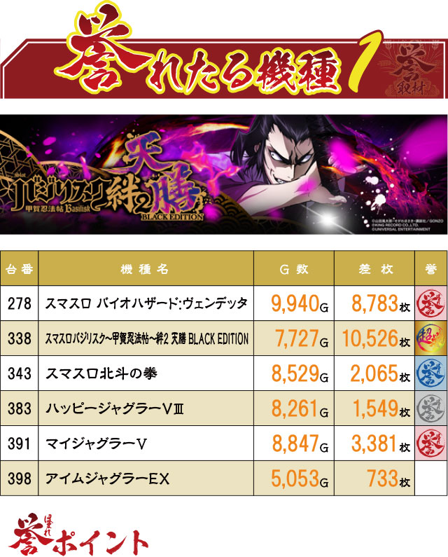 あれよあれよと『スマスロバジリスク~甲賀忍法帖~絆2 天膳 BLACK EDITION』が10,000枚を超える活躍を見せれば、負けじと『スマスロ バイオハザード:ヴェンデッタ』が8,700枚超えの奮闘。誉マークにまみれたこのブロックの盛り上がりは最高潮だった!
