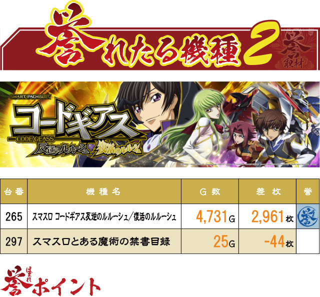 惜しくも赤誉マーキングを逃した『スマスロ コードギアス反逆のルルーシュ/復活のルルーシュ』。それでも優秀台としての責任は果たしたのではないだろうか。その一方でほぼ回されずに終わった『スマスロとある魔術の禁書目録』が不憫でならない…。