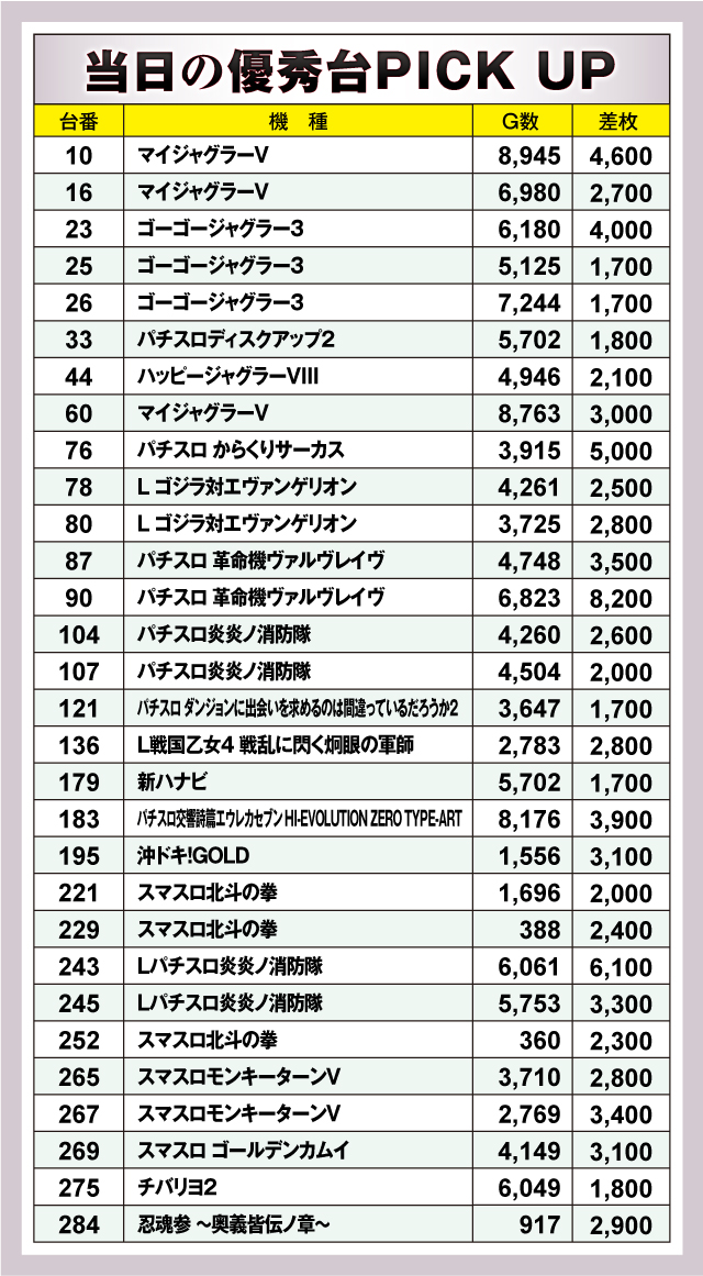 まずは優秀台30台のチェックから。30台のうち24台が+2,000枚オーバーを記録し、+3,000枚オーバーは12台出現。それらのなかでもっとも優秀だったのは、90番台の「パチスロ 革命機ヴァルヴレイヴ」で、差枚+8,200枚をマーク! またランクイン機種を見渡すと、スマスロを筆頭に多くの機種がランクインするなか、ジャグラーシリーズも多数ランクインしていたので、店内の至る所にチャンスが隠されていた可能性が高そうだ!