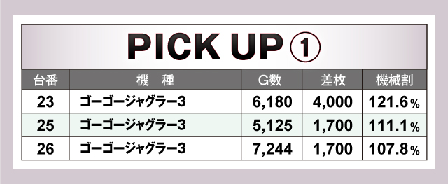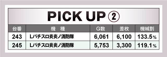 続いては、当日特に賑わっていた2機種を紹介しよう。まずは「ゴーゴージャグラー3」で、ピックアップ3台の平均差枚は+2,467枚と素晴らしい結果を残していた! 次に「Lパチスロ炎炎ノ消防隊」は、ピックアップ2台どちらも大幅プラスで、平均差枚も+4,700枚をマーク! これら2機種は、その他人気台やハイスペック機種に負けない好記録を残していた!