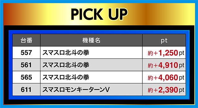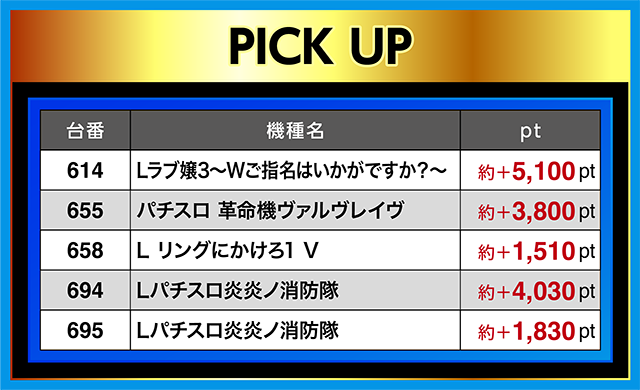 ほかにも、『パチスロ 革命機ヴァルヴレイヴ』の655番台は約+3,800pt、『L リングにかけろ1 V』の658番台は約+1,510ptと、優秀台が多数あった。