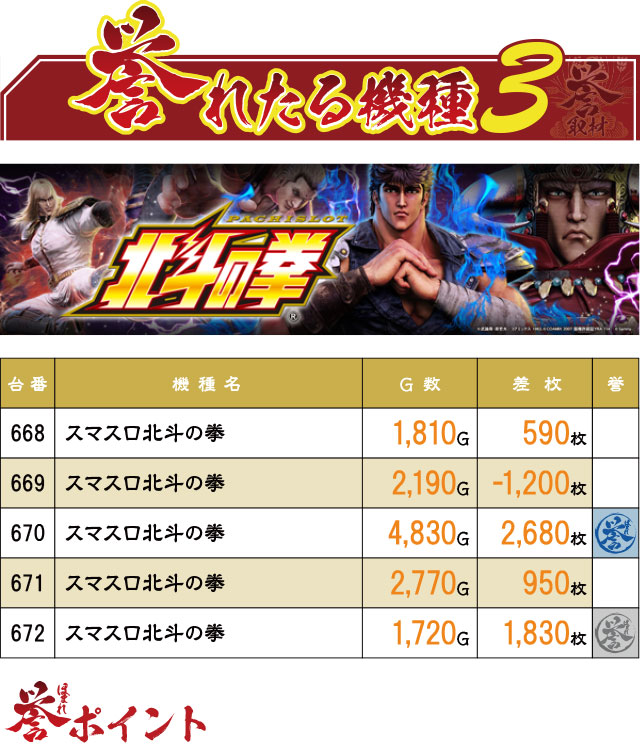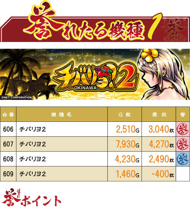 10台設置の『チバリヨ2』コーナーの中で、このブロックが最も勢いに溢れていた。それもそのはず、3台に誉マークが付いており、さらに内2台が赤誉マーキング。優秀台が固まっていたと見るべきか…!?