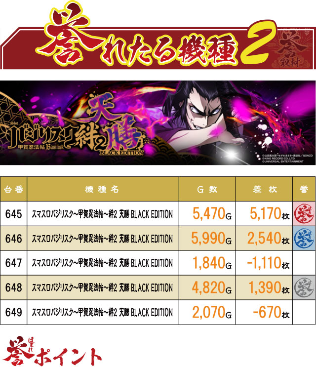 『スマスロバジリスク~甲賀忍法帖~絆2 天膳 BLACK EDITION』のコーナーでも勢いづいている台を確認。特に645番台は5,000枚を突破するほど好調で、周囲の台にも右肩上がりの台が複数あり!