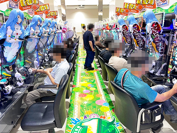5.5円パチスロの支持も厚く、様々な機種で楽しそうにレバーを叩くプレイヤーが見られた。