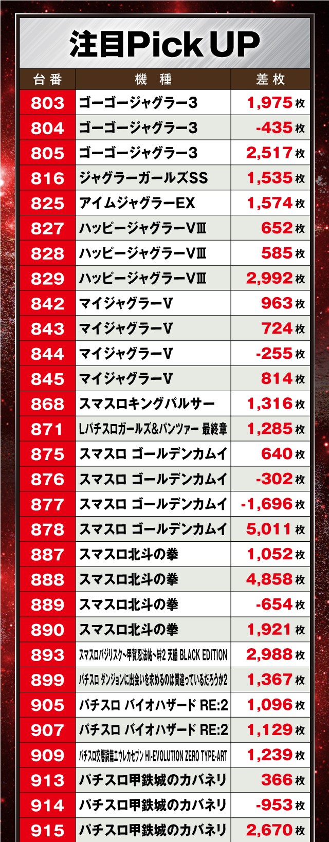 ほかにも+2,000枚・+1,000枚を超える好調台が続出しており、数多くのプレイヤーが心から遊技を堪能できていたように思う。この結果を踏まえて、次回のブラックデビルズ降臨の際も是非参考にしてほしい。