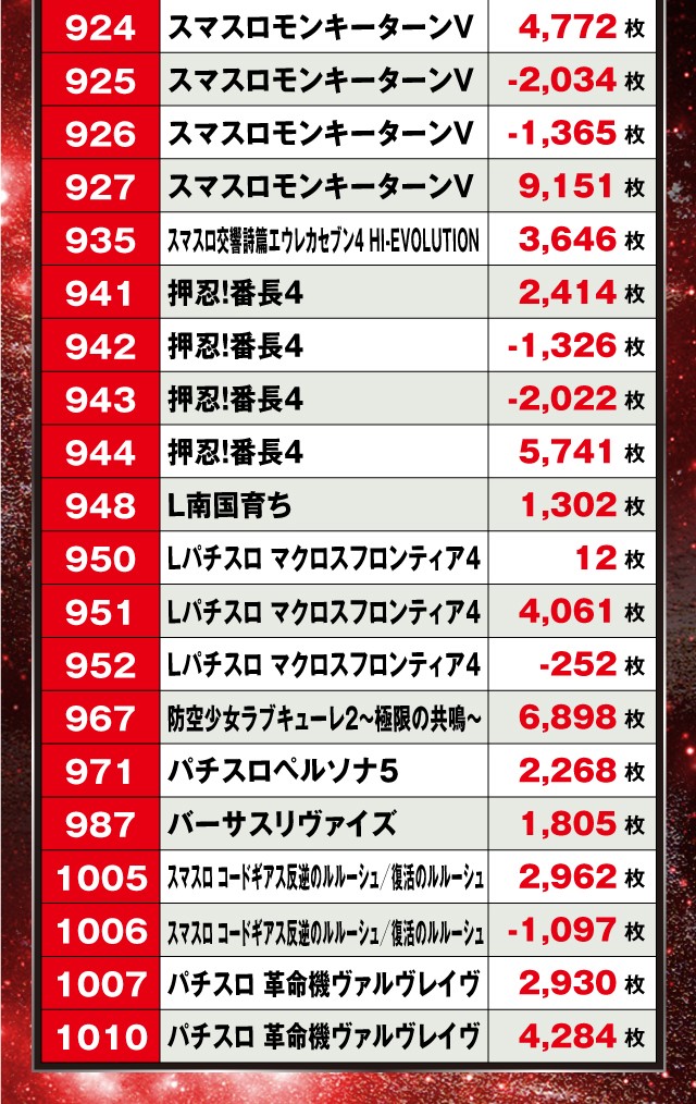 次は並びを見てみよう。今回は8ヵ所の並びが誕生するなか、もっとも活躍していたのが『スマスロモンキーターンV』だ。4台中2台がマイナスと波があったものの、平均+2,631枚と羨ましい結果を残していた。