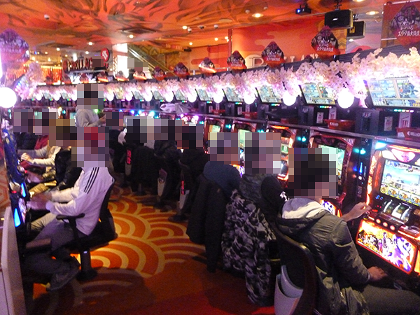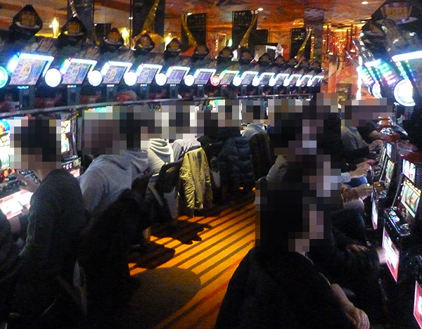 大阪府吹田市に位置するパチスロ専門店となっており、取材日は開店前から160名以上のプレイヤーが長い列を形成していた。