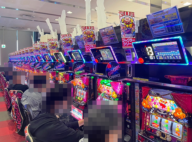 「マイジャグラーⅤ」を中心に笑顔がみられ、シマ内は華やかなムード。