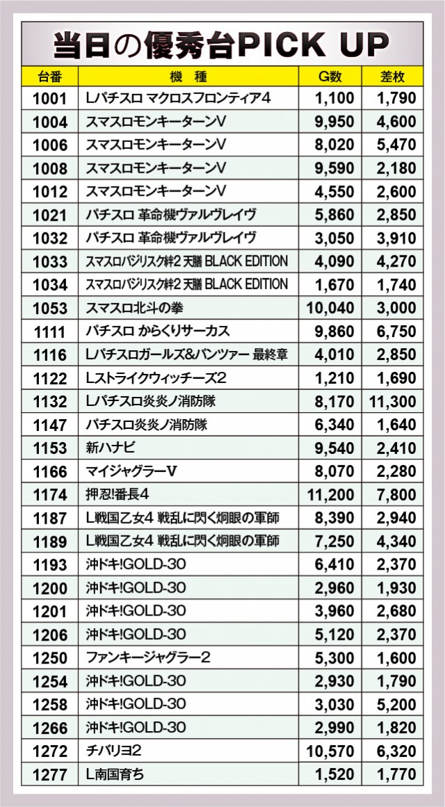 『スマスロ北斗の拳』『押忍!番長4』『チバリヨ2』と、当日は3台の万枚OVER台が生まれている。その中で『Lパチスロ炎炎ノ消防隊』1132番台+11,300枚と凄まじい熱気を放っており、全体を見通してみれば、ファンは打ちごたえのある状況に喜んでいたことだろう。各台でまとまった出玉を獲得している様子も顕著で、充実の内容と言えるだろう。