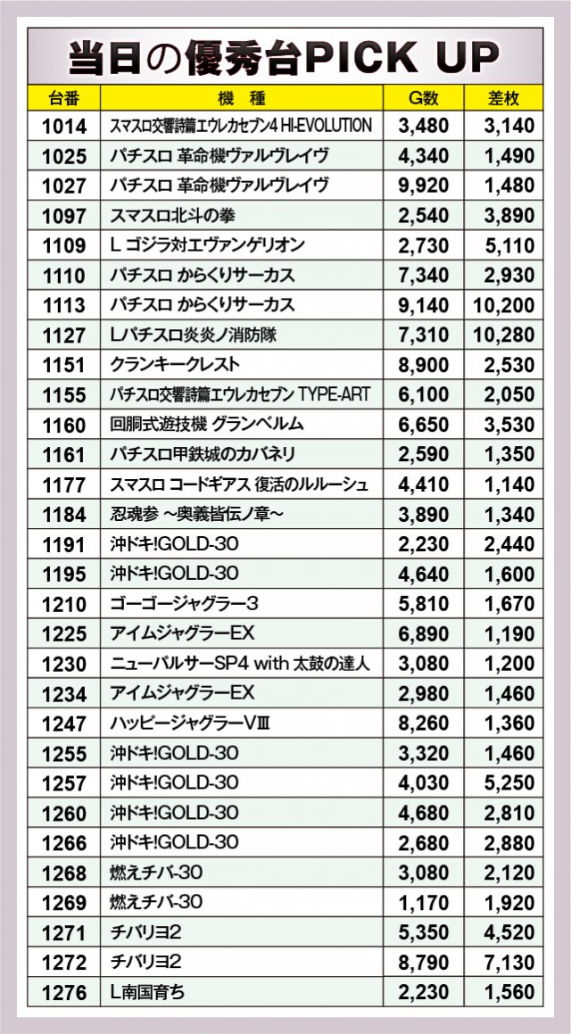 『パチスロ からくりサーカス』1113番台+10,200枚、『Lパチスロ炎炎ノ消防隊』1127番台+10,280枚と、当日は2台の万枚OVERが発生して高い熱量となった。『チバリヨ2』1272番台+7,130枚という数字も見逃せず、8~9千回転台をマークする台も見られたことから、同店の高い実力を感じずにはいられない。ファンも有意義な時間を過ごしていたのは間違いなく、一層に魅了されたのではないだろうか。