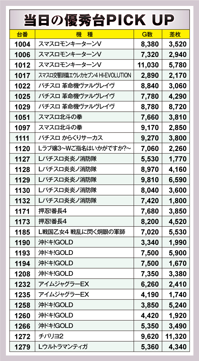 まずはこの日の優秀台トップ30からご紹介。目を引くのが『Lパチスロ炎炎ノ消防隊』と『沖ドキ!GOLD』の台数の多さ。『炎炎』は5台、『沖ドキ』は7台もランクインし機種の持つポテンシャルを十分に発揮できた環境にあったことがわかる。また『チバリヨ2』1272番台では万枚OVER! その他、様々な機種から好記録が続々と生まれていた。
