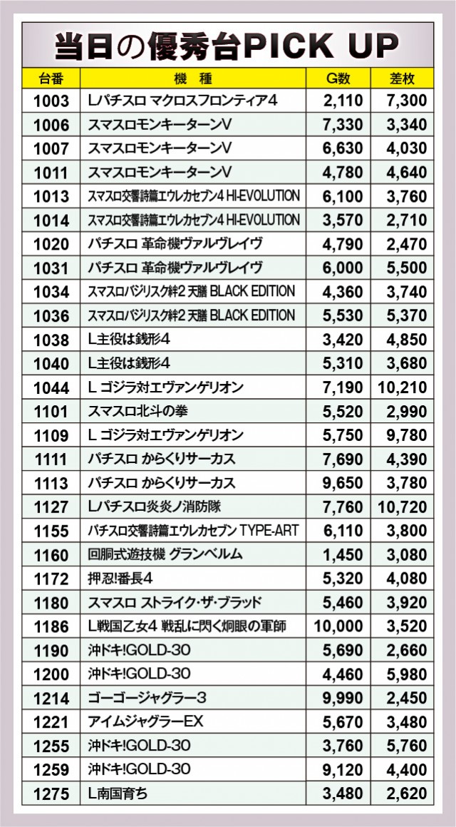 優秀台をチェックすると、大台突破台の多さに目を奪われてしまう。『L ゴジラ対エヴァンゲリオン』1044番台+10,210枚や『Lパチスロ炎炎ノ消防隊』1127番台+10,720枚と2台の万枚OVERが生まれれば、『L戦国乙女4 戦乱に閃く炯眼の軍師』では万回転OVERを確認できる。全体的に回転数と差枚数が比例した展開となっており、ファンは打ちごたえのある状況に歓喜していたことだろう。