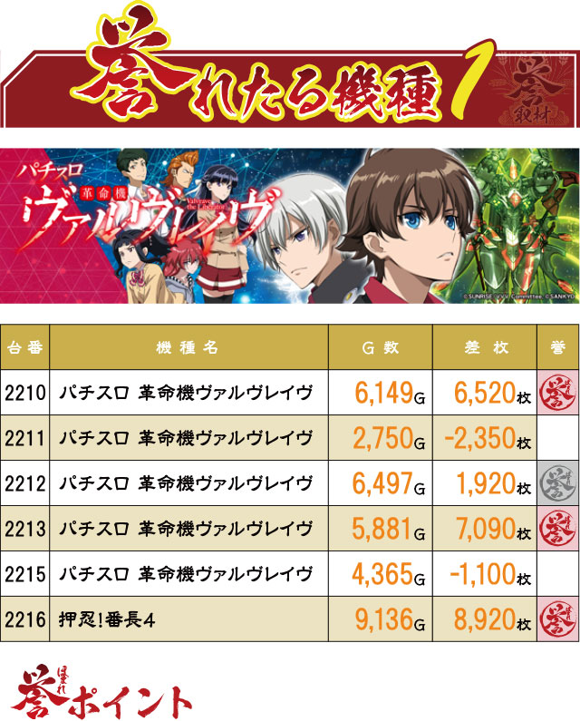 『パチスロ 革命機ヴァルヴレイヴ』と『押忍!番長4』の境目部分の6台は誉マークだらけ。4つの誉マークのうち、3つが赤誉マークであり、3台とも+6,500枚オーバーというとんでもない状況だった。