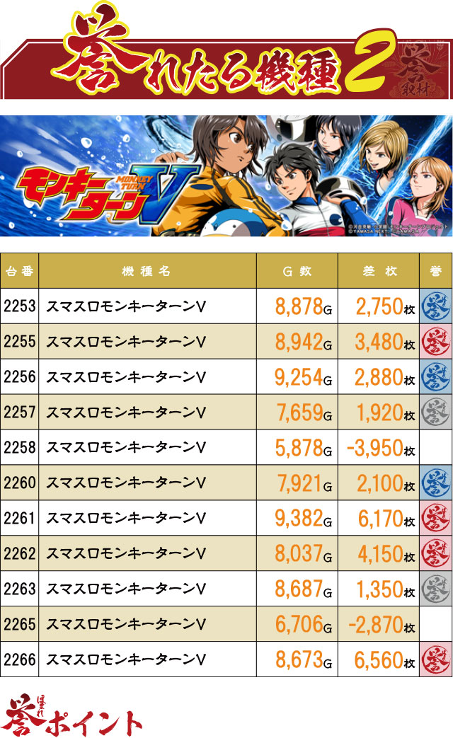 おそらく『スマスロモンキーターンV』には相当数の優秀台が潜んでいたのだろう。でなければ上表のような結果にはならなかったはず。ちなみに計17台の平均差枚は+1,542枚!