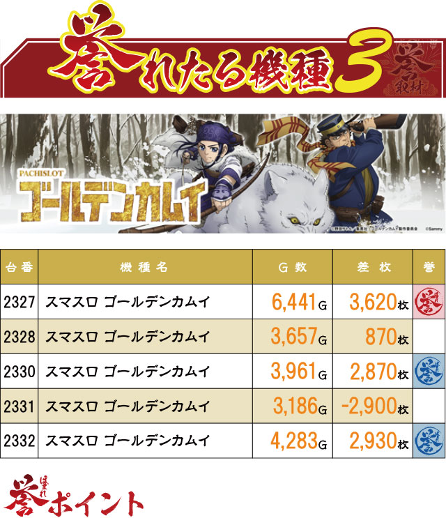 5台設置の『スマスロ ゴールデンカムイ』の勝率は8割(4/5台)!内3台に赤&青誉マークが付いており、もしかしたら全台が優秀台だった可能性も…。