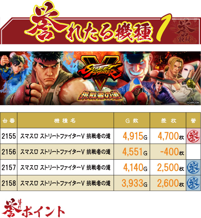 4台設置の『スマスロ ストリートファイターV 挑戦者の道』の勝率は75%。1台のみがわずかにマイナスとなってしまったが、4台の平均は+2,350枚という素晴らしい数値に。4台ともが優秀台だった可能性が高い。