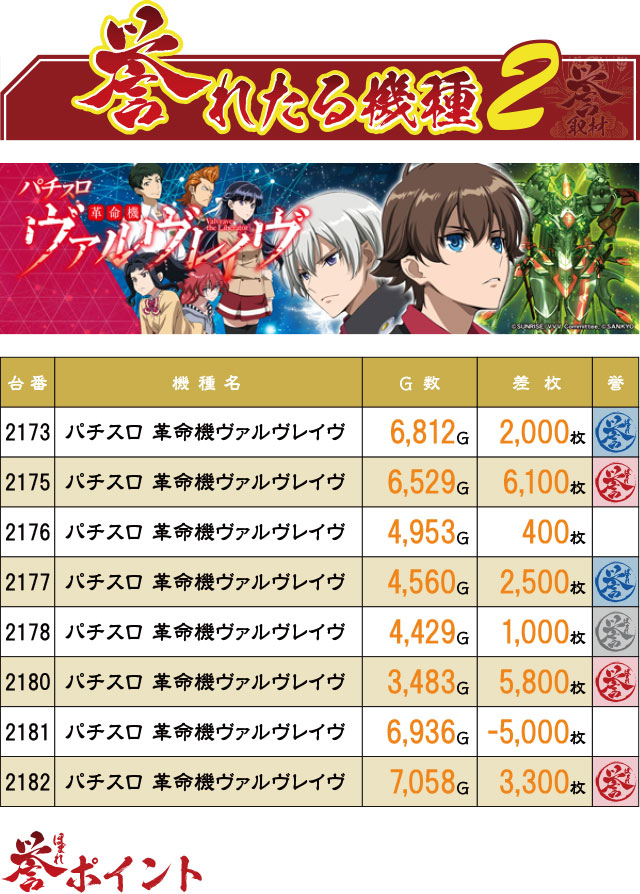 全17台が設置されている『パチスロ 革命機ヴァルヴレイヴ』のトータル差枚はプラス。その中でも勢いに溢れていたのがこの8台並びのブロック。8台中6台に誉マークが付くほどのポテンシャルを発揮していた。
