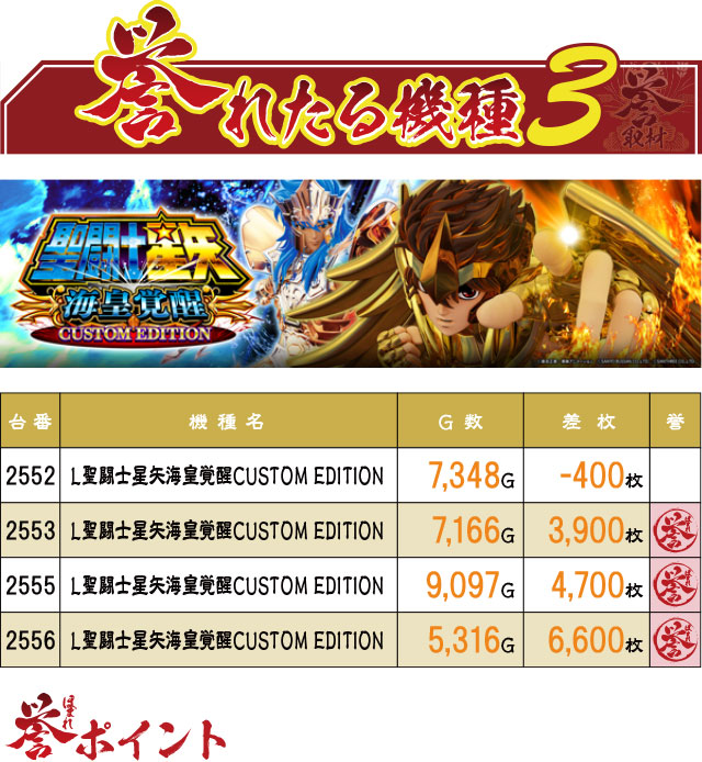 『L聖闘士星矢海皇覚醒CUSTOM EDITION』コーナーではこの3台に赤誉マーキング。僅差でマイナスになった2552番台を含め、8台中半分の4台が優秀台だった可能性も…!?