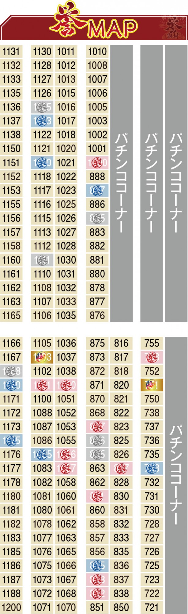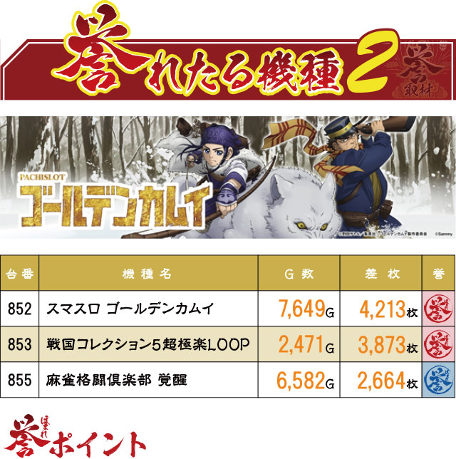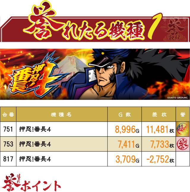 『押忍!番長4』の751番台が他を寄せつけぬ猛烈な勢いで11,000枚オーバーを達成!2台隣の753番台も追いつけ追い越せと大奮闘していたが、ついに追い抜くことはできず。それでも7,500枚超えを果たしているのだからお見事っ!