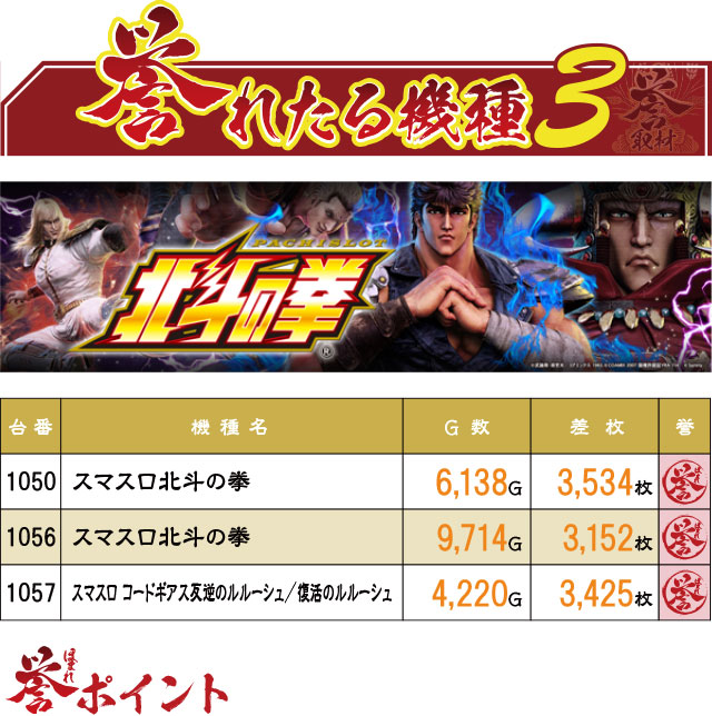 『スマスロ北斗の拳』と『スマスロ コードギアス反逆のルルーシュ/復活のルルーシュ』からも赤誉マークが飛び出した。3台ともに優秀台ムーブを見せており、そのポテンシャルに比例した結果となったようだ。