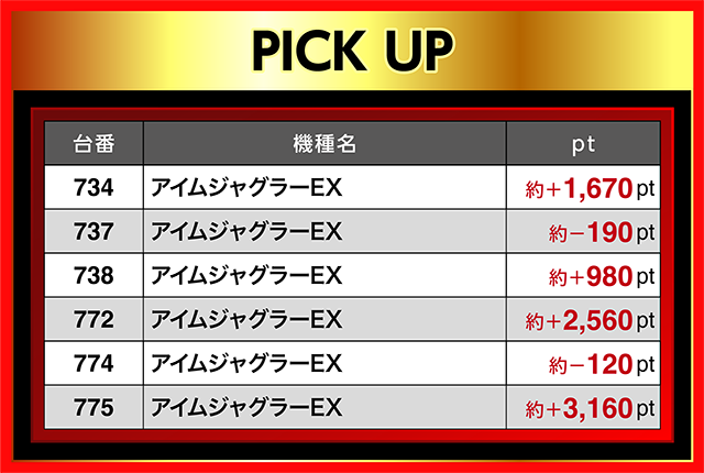 『アイムジャグラーEX』にも優秀台が多く、775番台は約+3,100ptを上回った。