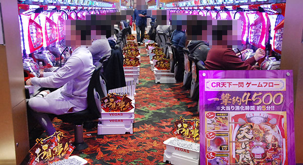 開店直後の4円パチンコでは、新台の「CRぱちんこ GANTZ」や「CR牙狼魔戒ノ花〜BEAST OF GOLD ver.〜」など、満席となる機種が多数。
