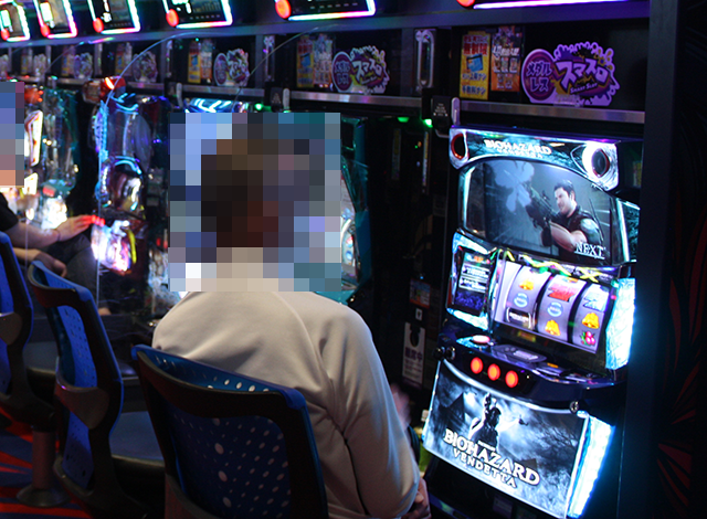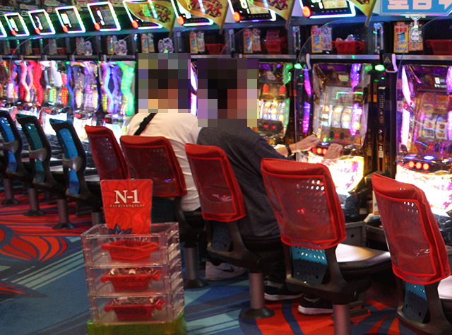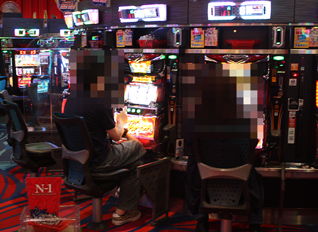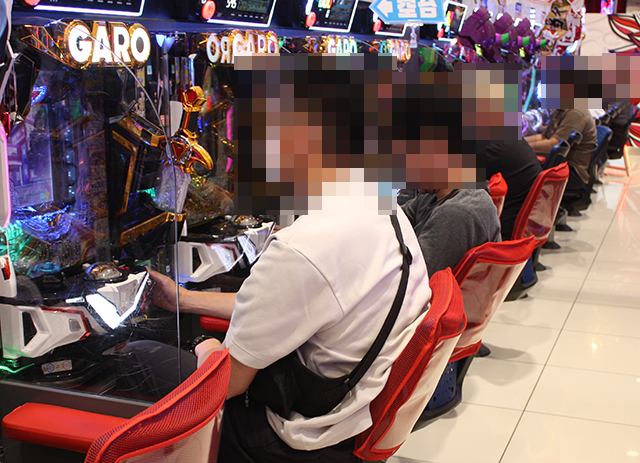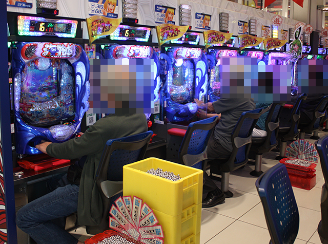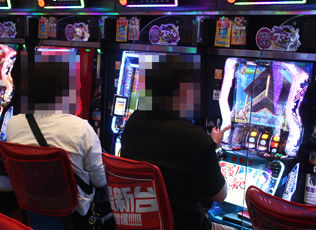 パチスロにもパチンコにも、明るい表情で遊技をおこなう姿が並んでいた。