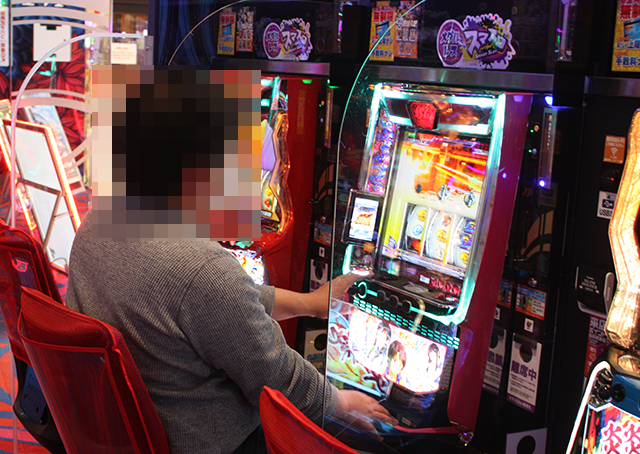 15時頃にパチスロをみてみると、「沖ドキ!GOLD-30」に4箱以上の持ち玉を使い、うれしそうに遊技をおこなっている姿があった。